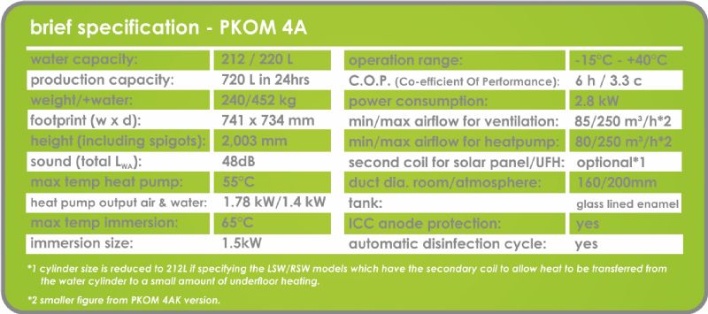 The PKOM 4A has a heat recovery ventilation matrix with not one, but TWO integral heat pumps for the separate heating of domestic*1 hot water and space heating, with COOLING. This aspect of the PKOM 4A is located above a 212L or 220L capacity hot water cylinder.